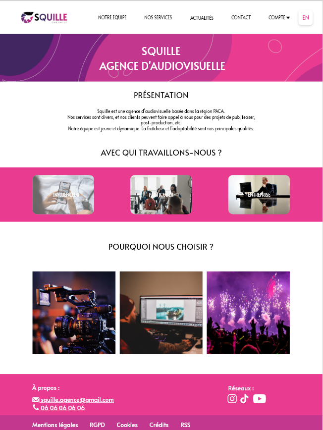 Lors de ma première année de BUT MMI à Toulon, j'ai participé à la création d'une agence fictive de communication nommée Squille. Ce projet, mené sur plusieurs mois avec une équipe de sept personnes, comprenait la réalisation d'un site web sous WordPress, l'élaboration d'une charte graphique, l'organisation d'événements avec sponsors, et le déploiement d'une campagne de communication. J'ai notamment contribué à la conception de la charte graphique, au développement du site WordPress et à la gestion des événements.